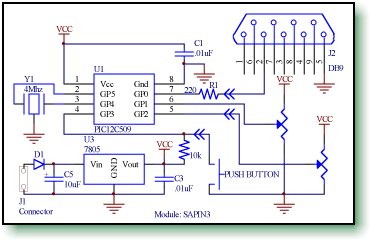 The 2 a/d inputs are applied to GP1 and GP2. The potentiometers shown are external and provide a 0 to 5 volt input. The single digital input is a pushbutton switch connected to pin 4 (GP3) and pulled up to VCC with a 10k resistor. The 5 volts to power the module is provided by the 7805 type regulator. |