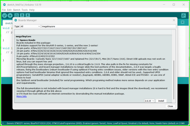 After this is under Tools/Board: select board manager and then search for and install megatinycore.