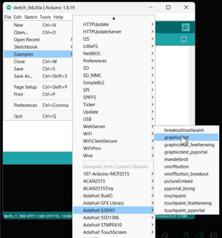Under Examples scroll down under Adafruit ILI9341 and select "graphicstest".